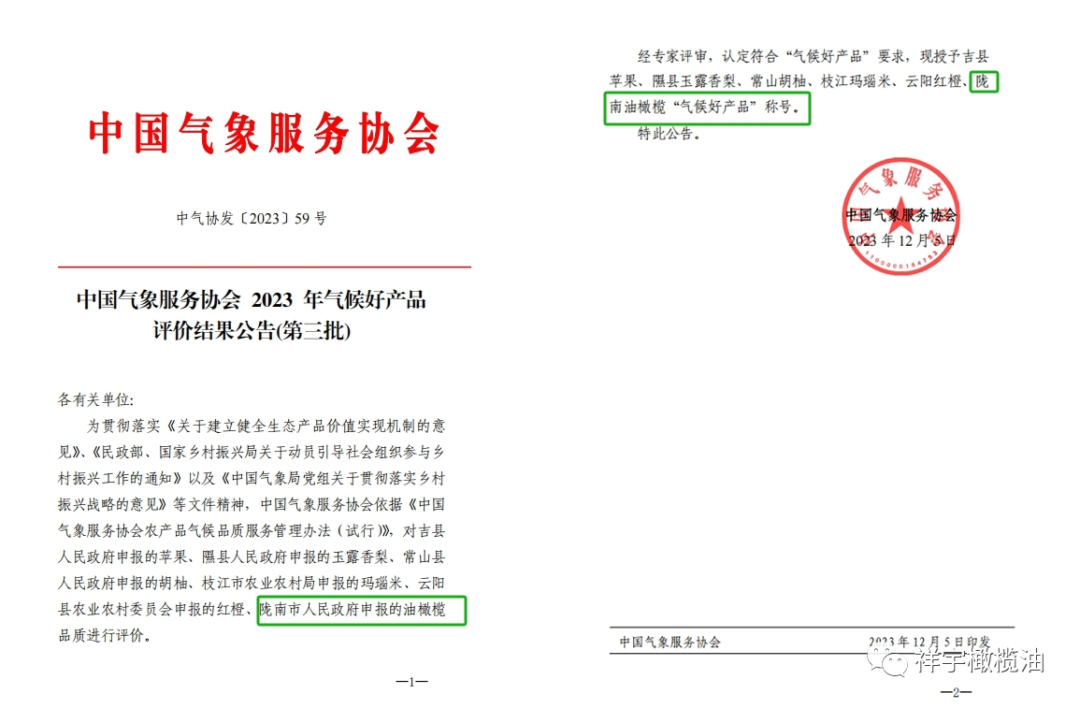 隴南油橄欖榮獲2023年“氣候好產(chǎn)品”稱號(hào)