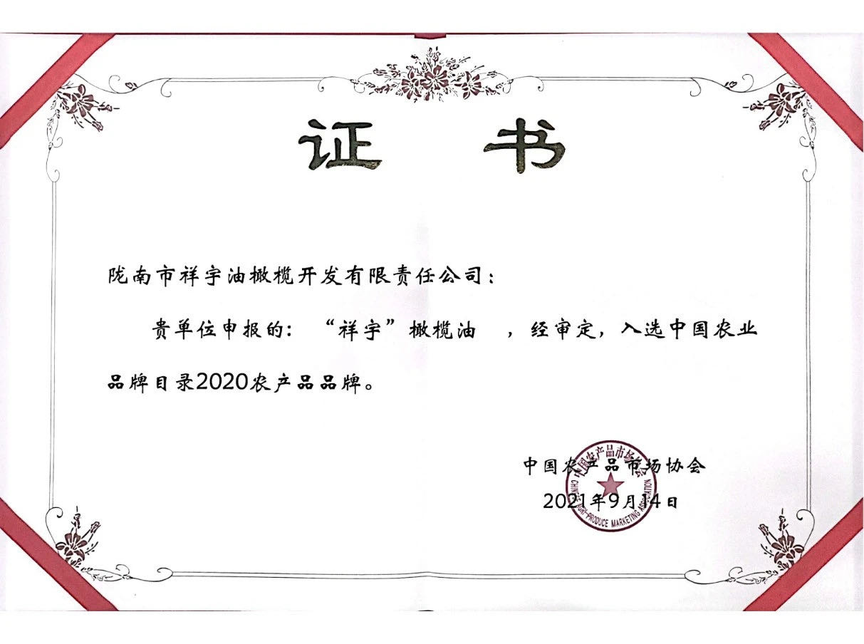 祥宇橄欖油入選中國農業(yè)品牌目錄2020農產品品牌!